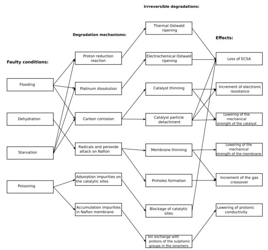 Steady state and dynamic operating regimes under faulty conditions speed up degradation. A schematic depicting the relations between the main faulty states, degradation mechanisms, and their irreversible consequences on the cell is depicted in Figure 1. The most relevant faulty conditions for stationary and mobile applications of PEMFCs include poor water management (flooding or drying out), reactants starvation, and the presence of contaminants in the fuel and in oxidant streams.