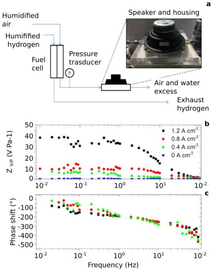 The application of EPIS on PEMFCs was performed by Engebretsen et al. [] and more recently by Shirsath et al. []. Both groups only conducted experiments under galvanostatic conditions registering the voltage responses and determining the EPIS transfer function (see Table 3). Engebretsen et al. [] developed a setup capable of generating back-pressure perturbations using a loudspeaker arrangement collocated at the cathode outlet (see Figure 3). Such a system allowed one to achieve input frequencies up to 100 Hz, but it has the disadvantage of producing signals with high noise content. They observed a monotonous increase of EPIS magnitude with an increase of frequency (Figure 3) apparently showing a single dynamics, while the phase (Figure 3c) displayed a decrement until the value of zero at low frequencies indicating that the input and output were in phase and no delay in the response was present. The EPIS magnitude increases with the steady state current density due to the higher mass transport resistance. EPIS spectra registered at different humidity values of the gas inlet show a sensitivity of this technique to this parameter on both anode and cathode sides.