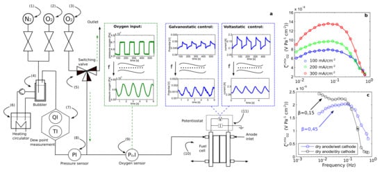 The first nonelectrical perturbation considered by several groups to develop alternative FRA methodology for fuel cells has been the cathode back pressure that has resulted in the establishment of the electrochemical pressure impedance spectroscopy (EPIS). The earliest work in this direction was the one of Niroumand et al. [] who observed the arise of cathode back pressure autonomous oscillations by using low flow rates inducing as a consequence of voltage sinusoidal waves. As the two periodic perturbations were not in phase, they related this phenomenon to the dynamics of the water accumulation in the cathode catalyst layer and GDL causing simultaneously the increment of the back pressure and diminution of the electrochemical catalyst surface area available for the ORR. This resulted finally in the lowering of the voltage. Based on these findings, they proposed to stimulate the cell through periodically modulated back pressure at a certain low frequency range (0.1–20 Hz) and to analyse the voltage response. The determined transfer function should be able to isolate contributions of the liquid and gas transport dynamics. Unfortunately, they were not successful to practically realise and demonstrate their idea. However, they developed a robust fault detection and isolation (FDI) algorithm which used the arise of the cathode back pressure and voltage oscillations as diagnostic criteria to isolate flooding from cathode and anode starvation []. Basically, the monitoring of sustained voltage oscillations which increased by lowering the cathode flow rate was labelled as flooding characteristics, while the sudden increment of the voltage amplitude over a certain threshold was implying cathode starvation. On the other hand, the lowering of the voltage without oscillations was considered a clear indication of anode starvation.