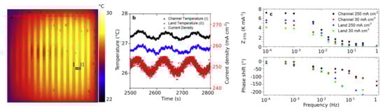 Following this general strategy, many characteristics of fuel cells have been improved. For example, a combination of experiments and simulation was used by several groups to investigate the effect of different flow field geometries in order to reduce the mass transport resistance on the cathode side [,]. Others have focused on the understanding of the relationship between the GDL features and resistance to oxygen transport [], water removal [], electron conduction, and heat transport [] using EIS in combination with other experimental techniques. Moreover, the employment of EIS for a better comprehension of the relationship between catalyst layer structure, its efficiency, and durability was extensive and supported the synthesis of MEA with optimised ionomer content, ionomer/carbon ratio, and platinum loading [,,]. Finally, the performance of membranes alternative to Nafion were also tested, for example poly-vinylidene-fluoride (PVDF) and polybenzimidazole [,].