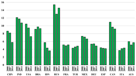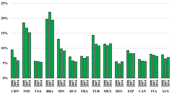 Despite the fact that in the analyzed countries, in general, the energy consumption related to food production is increasing, its share in total industrial activities’ energy use is decreasing (Figure 2). At the same time, this means that the energy consumption in other sectors of the analyzed economies is growing more quickly, on average, than in food production. The average share of food production in the industrial energy consumption of the analyzed countries in 2000 was 8.2%, which decreased to 7.5% in 2007 and to 7.2% in 2014. In developing countries, this percentage was larger, mainly due to the higher share of the food sector in the output of these countries. This phenomenon was also observed by other researchers [2,3]. In contrast, our calculations show that China is the exception. There, because of rapid industrialization, which causes high energy consumption in other economic sectors, the share of food production in energy consumption is lower [64]. The only country where the percentage of energy consumption from the food production system increased was Mexico; however, the increase was only 0.1 percentage point. In the remaining countries, this percentage has clearly decreased or remained at a similar level, when comparing 2014 to 2000. The highest decreases were recorded in Indonesia, 3.9 percentage points; China, 3.7 percentage points; Turkey, 3.5 percentage points; and India, 3.3 percentage points.