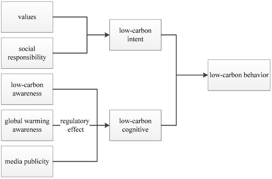14]. The market economy remains dominated by consumers, so low-carbon consumption behavior is ultimately realized by the consumers, which effectively connects production consumption with environmental protection. The public’s low-carbon cognition and low-carbon intention for low-carbon behavior have an important influence on the practice level [