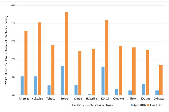 After Japan fully liberalized its retail power operation in April 2016, the number of power producers and suppliers (PPSs), that is, electricity utilities other than the ten dominating general electricity utilities, has increased significantly. The PPSs’ share of electric power sales in Japan is shown in Figure 1 [1]. Their total share has significantly increased from April 2016 to June 2020 in all areas. In particular, the share approaches 25% in the Tokyo area in 2020.