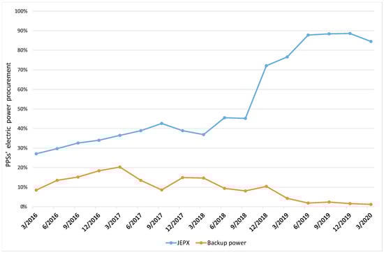 Nowadays, PPSs procure more than 80% of their total supply power from the Japan Electric Power Exchange (JEPX [2]), as shown in Figure 2. Although their backup power remains low, their electric power procurement has significantly increased in the last two years, especially from September 2018 to December 2018. The reduction in procurement cost in the JEPX market has been crucial for PPSs.