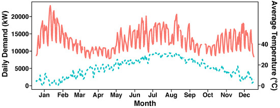 Daily demand (solid line) and average temperature (dashed line) of a research facility in 2018. Some of the demand data values are not depicted owing to missing values or outliers.