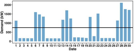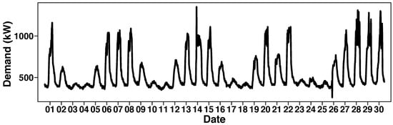 The actual event dates are observed only partially for confidential reasons. However, the electricity demand for the events is observed. Therefore, the event dates are subjectively determined as follows; events occur when the total electricity demand of buildings is beyond 750 kW, and not otherwise. Although the event occurrence strategy is subjective, a similar categorization is adopted in [76] to distinguish between usual and unusual days for peak demand forecasting. Figure 6 shows the daily electricity demand due to an event. We observe that the threshold, 750 kW, would be reasonable to judge whether an event occurs or not.
