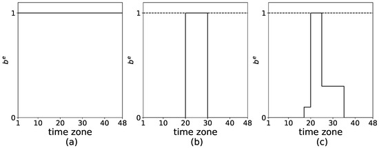 The basis function in Figure 5a may be useful for an event that uniformly increases electricity usage. We apply basis function (a) to real data in Section 4. Figure 5b corresponds to the event where the electricity for a specific time zone is increased. Figure 5c shows a more complex basis function than that in Figure 5a,b. Basis function (c) assumes two major facilities: one used during the day, and the other used only early morning. A basis function that is more complex than Figure 5 may be constructed according to the event characteristics.