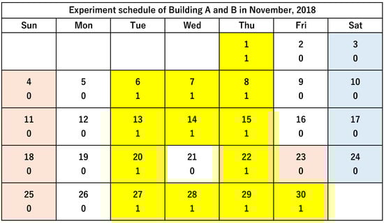 Schedule of experiments in research facility buildings in November 2018. Having experiments scheduled takes the value of 1, and is highlighted in yellow, and having no experiments scheduled takes the value of 0. Sundays and Saturdays are highlighted in orange and blue, respectively. The box on 23 November is highlighted in red because it is a national holiday.