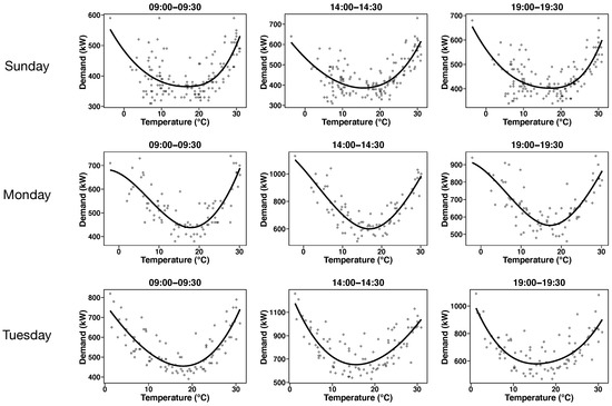 Figure 9 shows the demand and temperature at some specific time periods on weekdays in 2018. Basis expansion is employed for curve fitting using five B-spline functions. For easy interpretation, we exclude the demand related to events. For high and low temperature, the facility uses more electricity on high and low temperature days than on moderate temperature days due to air conditioner usage. The curves slightly differ among time periods, suggesting that our proposed approach based on the varying-coefficient model with basis expansion properly captures the temperature effect.