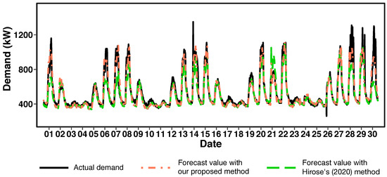 In this study, we evaluated the performance of our proposed procedure through the average demand deviation method. We also consider peak demand forecasting as an essential topic. For example, if a peak demand forecast with high accuracy could be achieved, it would enable us to conduct peak cut through the demand response [81], that is, managing the event. To forecast the peak demand, we need a technique specifically designed for peak demand forecasting, such as the transformation technique [82] and extreme value theory [83,84]. Another interesting future research topic is peak demand forecasting that takes irregular event information into account.