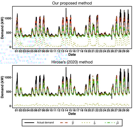 Our proposed model is similar to Fan and Hyndman’s [78] one in the sense that they applied smooth spline functions and forecasted half-hourly demand. However, they did not employ the varying coefficient model; the regression coefficients associated with the weather effect were different in each time period. With this approach, the number of parameters becomes large and the regression coefficients cannot be smooth across the time period, resulting in an unstable estimation. Another difference between our proposed method and Fan and Hyndman’s [78] one is the transformation of demand. Fan and Hyndman [78] showed that the logarithm transformation resulted in the best fit among the various transformations presented by Box and Cox [79]. Therefore, it is worth trying to conduct the logarithm transformation in our proposed model.