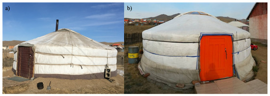 Two Mongolian gers installed for the experimentation: (a) The view of Ger 1; (b) Ger 2.