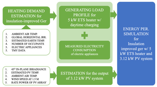 The energy performance simulation procedure for the ger with the ETS heater and solar PV is presented in Figure 3. The simulation data generally consisted of the total electricity consumption and the estimated output of the solar PV. The data resolution was 2 min, and the data set had the same period as the measurements from experimentation. The sum of the electricity consumption of the electric appliances and the generated electricity consumption of the ETS heater made up the total electricity consumption. Here, we used the electricity consumption of the electric appliances in Ger 2 measured from the experimentation. The load profile of the ETS heater scheduled to charge in the daytime was generated from the estimated daily heating demand of the Mongolian ger, which had an envelope material specified in Appendix A.