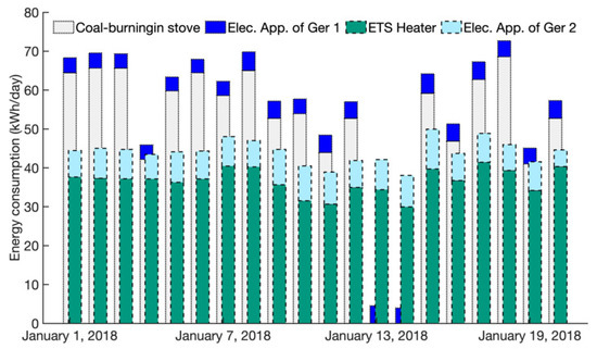 Figure 5 shows the daily energy performance of Ger 1 and 2 on the annually coldest days of the year, which are January 1 to January 20. The grey- and blue-colored bars indicates the daily heating consumption and electricity consumption of the electric appliances of Ger 1, and the daily energy consumption of Ger 2 is presented by green- and aqua-colored bars for the ETS heater and electric appliances.