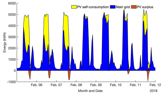 Figure 6 shows a daily operational profile of the ger with the ETS heater and solar PV for one week, which is 5th of February to 12th of February, as a simulation result. The validation results for the estimated PV output and heating demand are presented in Table A3 of Appendix C. The numerical values indicate the monthly average of the mean average percentage error (MAPE), mean absolute error (MAE), and root mean square error (RMSE).