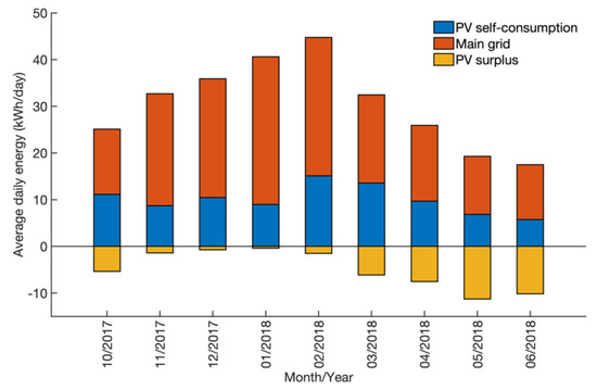 Figure 7 shows the profile of the energy performance of the Ger with the ETS heater and solar PV for the heating season. The energy performance is represented by monthly average daily energy consumption. For the period of the heating season, the fraction of electricity consumed in the ger from the solar PV is 31% of the total energy consumption. The remaining 69% is the amount of electricity imported from the main grid. The ger used 76% of the output of the PV system, while the PV system exported 24% of the total output of the PV to the main grid. The amount of solar PV exported to the main grid was a small fraction when the highest amount of heating energy was demanded in November, December, January, and February, and the self-consumption of PV increases because of the daytime charging of the ETS heater.