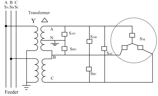 Figure 1 shows the load connection of open-wye/open-delta transformer. On the second side, the single-phase and three-phase loads are served by using the open-wye/open-delta transformer. At this time, it is equally served by two single-phase loads () at the primary side. The loads of can be calculated as Equations (1)–(3). Therefore, it does not matter which type of transformer is needed to connect to the feeder. There are many options to connect to the A, B, and C phases of the primary side.