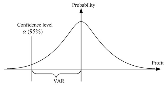 VAR is a widely-used method for evaluating the uncertainty of power output of renewable sources under various scenarios [22,23]. Value-at-risk (VAR) is a method of measuring market risk. It is an evaluation of loss due to market fluctuations under a specific period and a specific probability. The desired maximal loss is defined in a given specific probability which is called the confidence level to represent the degree of VAR. Figure 2 is the diagram of VAR. Ninety-five percent is the common value of confidence level. This means that 95% of the time, the user’s loss will be less than VAR, and 5% of the time, the user’s loss will be greater than VAR. This paper proposes a VAR for representing the uncertainty of WTs/PVs under various scenarios. Based on the historical data available, the VAR of the WTs/PVs penetrated was calculated by using the Monte Carlo method.