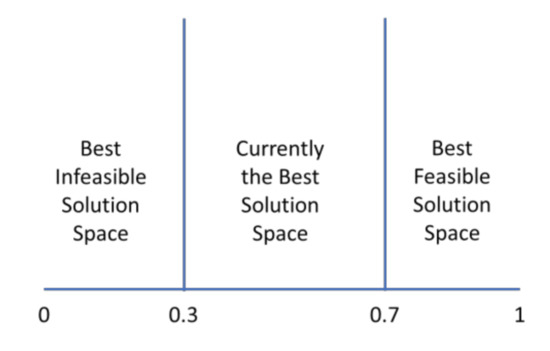 PSO has the characteristics of movement, evolution, elimination, and multiple variability. The movement in the PSO process is only dependent on the movement distance generated, and the movement information is transmitted between the particles. It is easy to converge to the local optimum. FPSO introduces the auto-adjust scheme by using the random parameter to assign the “infeasible solution ()” and the “feasible solution ()” into the solution space in order to make the PSO more efficient in the search for a global optimum as indicated in Figure 5. As indicated in Figure 5, the “infeasible solution ()” space may be an attractive solution in the nearest future. An improvement on the auto-adjust scheme solution begins with finding the best direction to take in order to attain a global optimum. Hence, the velocity in FPSO can be modified as Equation (22).