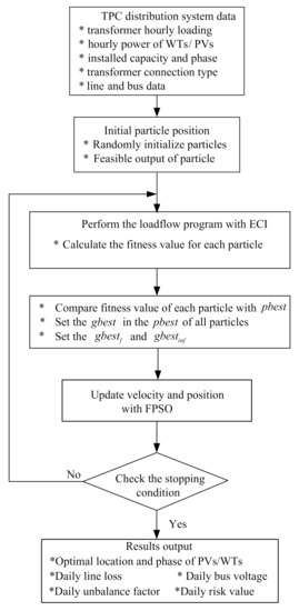 In this paper, the Monte Carlo method [19,20] is used to calculate the generation value-at-risk (VAR) of presented WTs/PVs. Using the historical data of wind speed and global radiation, the generation VAR of WTs/PVs is derived under a given level of confidence. Considering the various confidence levels of risk, a feasible particle swarm optimization (FPSO) is proposed to optimally incorporate WTs/PVs into a distribution system and achieve optimal phase arrangement of distribution transformers under operating constraints. A three-phase power flow program with equivalent current injection (ECI) [21] is used to simulate and compare the system unbalance factor, voltage profiles, and system loss after the phase arrangement of transformers. A Taipower distribution system is proposed to demonstrate the operating efficiency and feasibility of the proposed algorithm. Results can help operators to not only appropriately install the WTs/PVs location but also the optimal phase arrangement of distribution transformers in order to reduce system loss and maintain the voltage profile. They can also provide more risk information in uncertain environments when the WTs/PVs are connected to the distribution system.