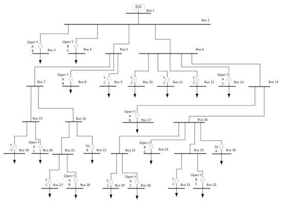 To prove the effectiveness of the proposed algorithm, a Taipower feeder, as shown in Figure 7, was adopted to simulate its efficiency [27]. There are 32 buses in this feeder which serves residential, commercial, and several small-industrial customers. A total of 3648 different users are linked to the Taipower feeder. Table 2 shows the connected status of distribution transformers in this feeder. The rating output of WT and PV is 200 kW and 40 kW, respectively. Two PVs and two WTs are installed on the bus of the distribution feeder. Three cases were simulated in this study.