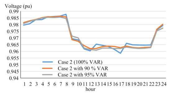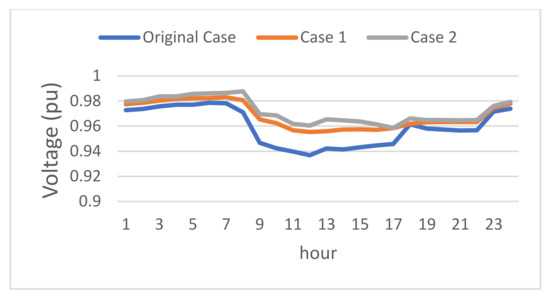 Figure 8 shows the comparisons for the daily minimal voltage profiles of all buses. In Figure 8, the minimal voltage of all buses is operated from 0.938 pu to 0.974 pu in the original case, from 0.957 pu to 0.983 pu in Case 1, and from 0.956 pu to 0.985 pu in Case 2. In the original case, the minimal voltage is 0.937 pu, which violates operating limits. It can be shown that the voltage profiles can be improved after the phase arrangement and the installation of WTs/PVs.