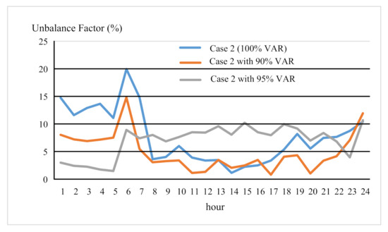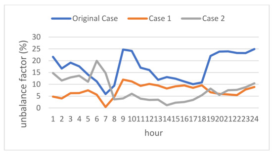 Figure 9 shows the daily system unbalance factor at the terminal bus. In Figure 9, the maximal unbalance factor is 25% in the original case, 12% in Case 1, and 20% in Case 2. It is observed that the proper phase arrangement will get a lower unbalance factor than that without phase re-arrangement.