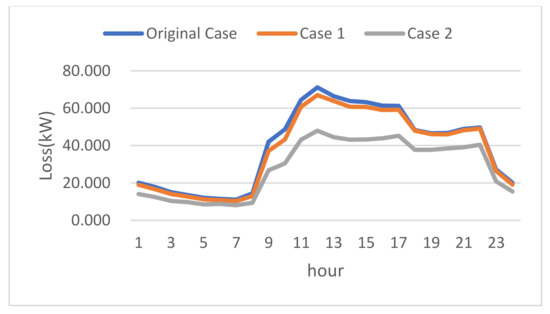 Figure 10 shows the daily system loss profiles. The daily system loss is improved after phase rearrangement and installation of WTs/PVs. Total system loss is 945.775 kW in the original case, 901.860 kW in Case 1, and 679.459 kW in Case 2. As Figure 10 indicates, the profiles with WTs/PVs installed and phase rearrangement have more loss reduction.