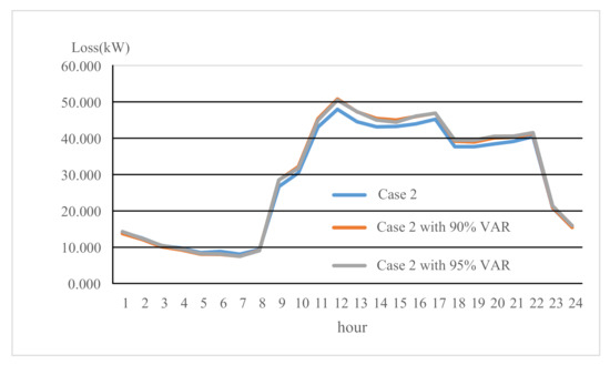 Figure 13 shows the VAR of daily system loss at the various confidence levels ( = 100%, = 95%, = 90%). The VAR of total loss in a day corresponding to 100%, 95%, and 90% is 679.459 kW, 701.624 kW, and 703.766 kW, respectively. Similarly, a higher confidence level leads to a higher VAR of system loss, which is lower risk.