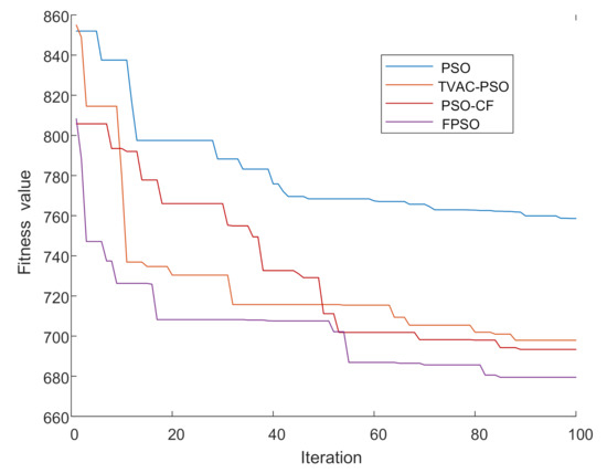 Figure 14 illustrates the convergence characteristics of PSO, time variable acceleration coefficient with PSO (TVAC-PSO) [28], PSO with constriction factor (PSO-CF) [29], and FPSO in Case 2. The tests were carried out on an Intel core i7-6700 3.4GHz CPU with 8 GB DRAM memory. In Figure 14, the improvement of the FPSO over other algorithms is clear. Table 5 shows the maximum, minimum, and average convergent fitness values tested in Case 2 at 100 times. Although the solution’s improvement is subtle, it shows the ability of the FPSO to look for a global optimal position.