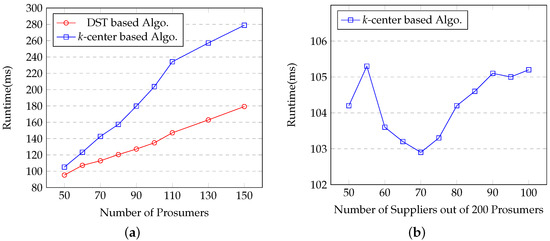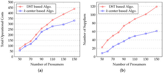 Figure 5a validates the theoretically proven computational overhead by presenting the running time of the two approximated scheduling algorithms. As the number of prosumers increases, the runtime of the k-center problem-based algorithm grows faster than the other approximated scheduling algorithm does, even though it works better for the operational cost and the size of the suppliers. In accordance with Algorithm 3, this is because of the exhaustive search strategy used to find a specific number of energy suppliers from the solution for the k-center problem, where k ranges from 0 to