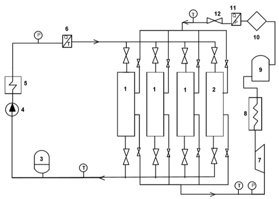 Three heat exchangers with porous inserts and one heat exchanger without porous materials were fixed on the test bench. The heat exchangers were counterflow: water flows through the central copper pipes, and freon moves in the opposite direction through the pores of inserts. The motion of water is carried out by a pump. The water temperature can be changed since the boiler (5) is installed after the pump (4). A refrigeration circuit was created for freon motion. Thus, the unit included two circuits: one for water circulation, the other for freon circulation. The first circuit with water was equipped with pump (4), boiler (5) for heating water, and control and measuring device (6), which makes it possible to track the change in water temperature over time and monitor the mass flow rate. The freon circuit is created using the principle of a refrigeration unit and is equipped with compressor (7), condenser (8), receiver (9), a moisture-separating filter, (10) and a throttle (12). In addition, the freon circuit (Figure 1) was equipped with devices for measuring temperature and freon pressure at the inlet and outlet to the compressor and flow meter (11). The unit operates on R404a freon, as it is one of the safest fluids for this kind of work.