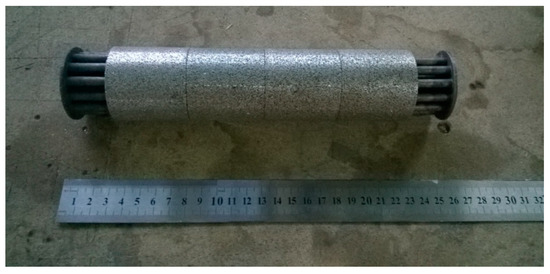 In this work, four types of heat exchangers were investigated. Three of them were with various porosities, and the fourth one was without inserts. The porosity of the inserts p was taken as the ratio of the pore volume to the entire volume of material. Three heat exchangers were made using aluminum with porosities of p = 0.49, p = 0.62, and p = 0.47 (located one after another and denoted as 1 in Figure 1). The porous parts of heat exchangers were cylinders made of porous aluminum with a diameter of 49 mm and a height of 50 mm. To insert the pipes through which the coolant flows, each cylinder had 19 holes of 6 mm each (Figure 2). There was no porous filling in the fourth heat exchanger. Aluminum was chosen as a material with high thermal conductivity. The most widely used metals with high thermal conductivity are copper, aluminum, and brass. Copper has a higher thermal conductivity (400 W/m∙K), but it is a “heavy” metal, less ductile (so to speak) than aluminum, and 3–4 times more expensive than aluminum in cost. Brass, as compared with aluminum, has a lower thermal conductivity (100 W/m∙K), and in addition, it is a “heavy” metal and has a higher cost. Therefore, aluminum was chosen as a light, cheap material with good thermal conductivity (202 W/m∙K). Moreover, making inserts from aluminum shavings is a rather simple process.