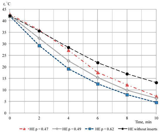 Further, laboratory experiments were carried out to assess the intensity of the heat exchange of each heat exchanger. Before the main experiment, test runs were carried out for setting up the equipment. The experiment ran for 10 min. The water heating temperature of 40–45 °C was chosen, as during the operation of heat exchangers of the heat and gas supply system, the water temperature range was within 35–50 °C. The device’s readings were recorded every 2 min. The interval for fixing the parameters was selected based on the test runs, in accordance with the most indicative temperature change after the considered period of time. The experiments were repeated many times. Based on the obtained data, graphs of temperature changes in time were constructed for the simultaneous operation of two circuits, Figure 4. The subsequent plots were constructed for the flow of 1.1 m3/h for the opened valves.