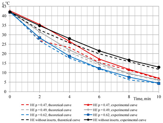 The theoretical curves in Figure 6, depicting the change in freon temperature at the outlet of the heat exchanger, for HEs with porous inserts were obtained as a result of calculations using Equation (9). The theoretical curve for a heat exchanger without porous inserts was obtained using the traditional method of thermal calculation for shell-and-tube heat exchangers. The increase in temperature during the first 2 min of operation (Figure 6) was explained by the stabilization of the operating mode from the moment the unit was turned on. During this time, the stationary operating mode was reached. The deviations of freon temperature at the outlet of the heat exchanger obtained from calculations are presented in Table 1.