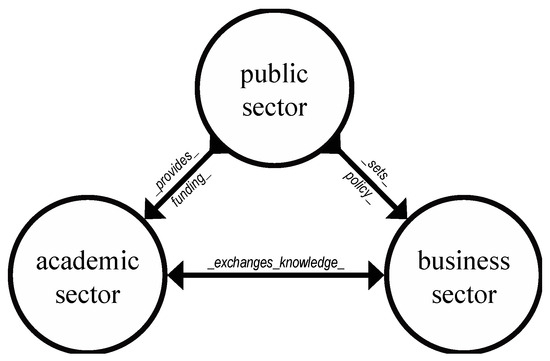 The World Bank describes a knowledge-based economy as one in which the sustained use and creation of knowledge are at the core of the nation’s economic systems and their development [20]. Countries such as the UK have seen an accelerated change in their transition from being resource-based to knowledge-based economies during the second half of the 20th century. It is argued that the national governments leading these knowledge-based economies have begun monetizing knowledge as innovation and knowledge are increasingly seen to be the driving forces behind economic development, job creation and improved social standards [21,22]. These socio-politico-economic changes have created new expectations from the academic institutions, particularly those operating within the HE sector. As a consequence, individual academics and institutions are now required to engage in research activity that is relevant to and undertaken in collaboration with business sector (or) industry. This co-creative and collaborative interaction between the public sector, academia and industry is conceptualized as “Triple Helix” (Figure 3). It is similar to the tradition Knowledge Transfer and Exchange models but with the public sector with an explicit role in the setting of policy and as the significant funding body. As a model, it defines the role of government and the public sector in a policy definition and strategic funding or enabling role and recognises the widening context of contractual arrangements for research and partner working between different sectors.