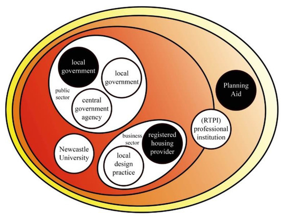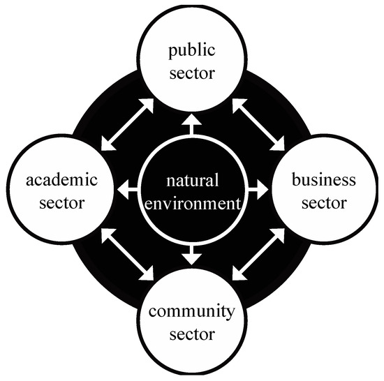 We have considered this Quintuple Helix as one of the most effective frameworks for describing current practice and one that allows for the consideration of the environmental and societal factors central to sustainable communities. Gouvea et al’s [30] diagrammatic representation has been adapted (Figure 6) to clearly differentiate a nested model with the Triple Helix as the traditional knowledge core comprising the academic, public and business sectors but set within the social context, which is itself set within the environmental context.