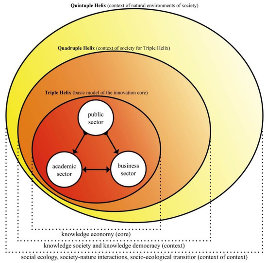 - Carayannis, E.G.; Rakhmatullin, R. The Quadruple/Quintuple Innovation Helixes and Smart Specialisation Strategies for Sustainable and Inclusive Growth in Europe and Beyond. J. Knowl. Econ. 2014, 5, 212–239. [Google Scholar] [CrossRef]