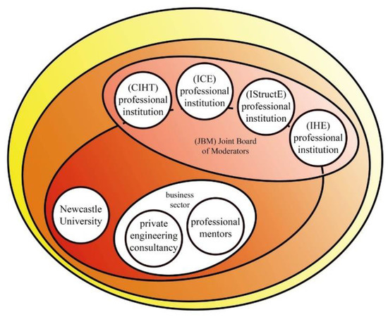 Design for Sustainable Engineering Systems (Figure 9) is a module that places sustainability as a compulsory element of two separate degree programmes (Newcastle University) offered for second or final year students. It is accredited by, and thus closely associated in terms of design with, four separate professional institutions, namely ICE, IStructE, the Chartered Institution of Highways and Transportation (CIHT), and the Institute of Highway Engineers (IHE). It is moderated by a collective of these professional bodies called the Joint Board of Moderators (JBM).