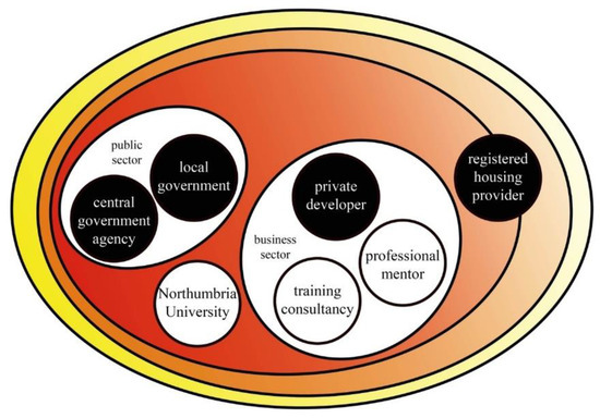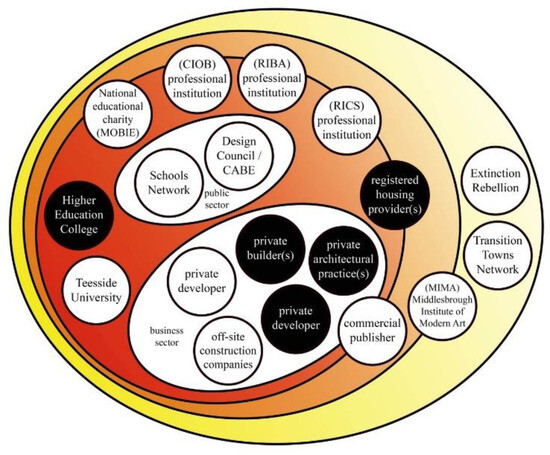 The Future Homes module is part of a distinctive post-graduate programme designed by the MOBIE educational charity and academic partners (Teesside University, Middlesbrough, UK). It is distinct in the scope of thinking around collaboration and interdisciplinary as a means of disrupting current practice sin the housebuilding industry. The programme has a mix of full and part-time students but all with professional and academic experience in sustainable design and ABE disciplines, and this breadth of sector experience for the students themselves evident in the mapping (Figure 14). Assessments comprises a mix of group projects and individual work but both being closely aligned to contemporary industry challenges. In many cases, delivery of module content and the setting of assessments has deliberately been driven by stakeholders outside of the academic sector and as such the number and diversity of organisations involved extends well beyond the traditional knowledge core.