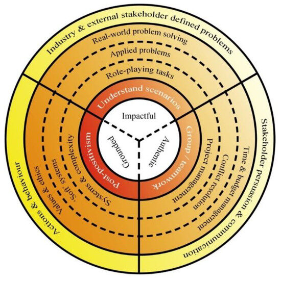 It is paramount that the modules and degree programmes attempting to impart Sustainable Development Education incorporate some of the key aspects of United Nations Sustainable Development Goals which require interdisciplinary approaches for their delivery. Academic teams involved in Sustainable Development Education must operate in a “holistic framework” rather than engage in either pure science/technology-based or social-realist, ideological approaches as this could hinder the broadening of the students’ mindset and knowledge base. Learning theory [39] itself developed from historical theoretical models that explicitly link theory and practice; and blurs any distinction between “hard” (scientific) and “soft” (social/qualitative) knowledge. In this pragmatic context, there is weight in decision-making to heuristic knowledge, or knowledge gained through “learning by doing” as it presents a useful cycle of practical or practice-based learning and in so doing, hinting at the importance and/or relevance of lifelong learning and continuing professional development for ABE professions. The Sustainable Development Education related modules must expose students to design projects, problems and tools in a manner that the students are encouraged to find solutions outside the “eco chambers” and “hierarchies” of the professional domain of their choosing. The scope of the projects set for students in Sustainable Development Education modules must be broad enough that they invite a wide range of perspectives to be employed in finding solutions to these projects or problems. Within the specific programmes and modules, there are multiple opportunities for incorporating this practical learning or reflective cycle with the inclusion of a reflective task, in so doing, demonstrating that it is a continuous “reflective” process. The broad professional scope of activities has to be explicit, rigorous, systematic and structured.