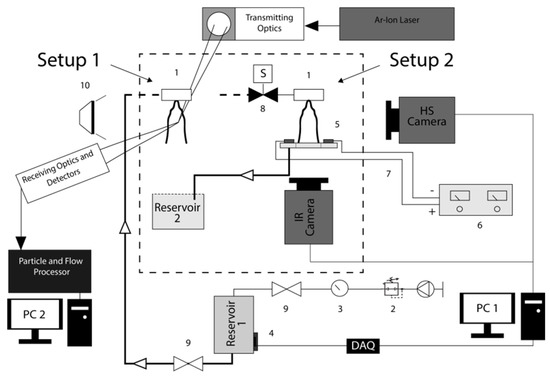 A continuous current power supply (HP 6274B DC) heated the sheet by Joule effect, as depicted in Figure 1, index 6. In configuration II, high-speed visualization of the leading spray structures is synchronized with a high-speed infrared (IR) thermographic camera (Onca-MwIR-InSb-320, from Xenics), capturing images from the bottom side of the heated surface. The bottom side painted with a black matt ensures an emissivity of 0.95, according to the manufacturer. The thickness of the painted layer is optimized to decrease the thermal resistance and measure the transient surface temperature distribution with accuracy.