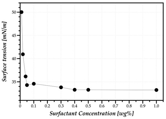 A rapid decrease in the surface tension value when the surfactant concentration increases just to 0.04 (wt.%) is evident in Figure 2. Then, surface tension values remain nearly constant up to relatively high CTAB concentrations (up to 1 wt.%). Hence, the working surfactant concentrations set in the range between 0.05% and 1% ensure the conditions mentioned above.