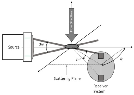 A two-component PDI from Dantec Dynamics A/S (Skovlunde, Denmark) acquires droplet size and velocity information. The system consists of a 55× transmitting optics, a 57 × 10 receiving optics, and a multi-line Argon-ion laser from Spectra-Physics type 177—G0232. A Dantec Burst Signal P80 unit processes the measured signal, and the BSA flow software v5.20 controls the data acquisition parameters with the following setting: photomultiplier sensitivity ranged between 1180 and 1500 V, the signal gain at 22 dB, the velocity center is at 15 m/s with a 30 m/s span. The laser has a power of 400 mW, and the wavelengths used was 514 nm. The beam spacing was 60 mm, and the frequency shift was 40 MHz. The transmitting focal length was 310 mm. As for the receiving optics characteristics, we set the scattering angle to 69°, which is the angle that allows water measurements to be more independent from specific parameters such as the refractive index. The receiver focal length was 500 mm. The work reported here considers only the axial velocity component U since it is the relevant component applied in the empirical models used to predict the outcome of drop impact. Figure 3 depicts the PDI configuration with θ, ψ, and ϕ as the beam intersection angle, elevation angle, and scattering angle, respectively.