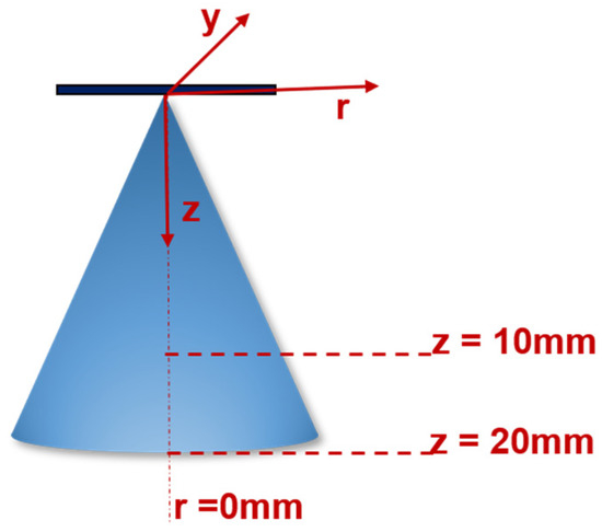 Figure 4 shows the measurement grid using a radial system where r = 0 mm corresponds to the spray cone center. The planes below the nozzle tip are at z = 10 mm and z = 20 mm, ensuring a fully developed spray without ligaments expected to fragment into droplets. Measurements in the Z-plane consider a range of −20 mm < r < 20 mm and −20 mm < y < 20 mm in 2 mm steps on two radially orthogonal axes. Using an information-theory approach, the accuracy in the measurement of drop sizes is lower than 2.1%, according to [31]. In the regions with lower droplets count (close to the central spray axis), the sample size was up to 5000 samples. However, the error did not overcome 1.7% despite being more sensitive to inaccuracy, which means the acquired information was enough.