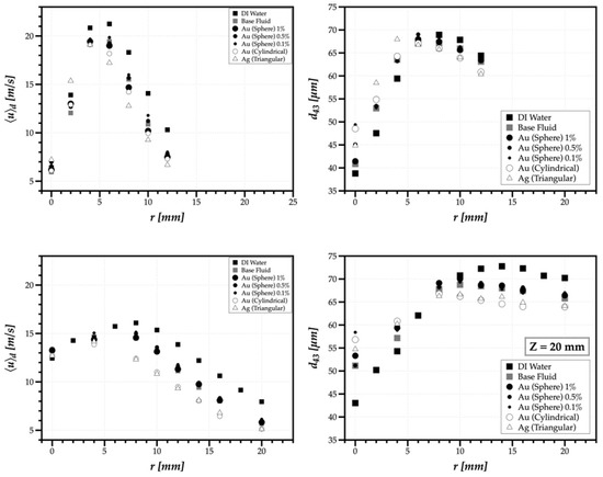 The results in Figure 5 are consistent with those previously reported in [27] using a similar atomizer. The smaller mean diameter in the central region (r = 0 mm) indicates the presence of more droplets of smaller sizes, transported by aerodynamic effects. At the z = 10 mm plane, the values are similar for all cases considered. Only at z = 20 mm, after ∆z = 10 mm of particle–fluid interaction, do the results begin to express the effect each nanofluid exerts in the spray dynamic characteristics. Namely, the maximum mean velocity value shifts to the central region of the spray with a slightly lower value. Additionally, after the location where faster droplets are present, the variation of with r remains similar. Noteworthy are the differences between DI Water and the base fluid (water and CTAB) and the nanofluids’ results with gold nanospheres from other shapes.