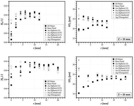 The changes observed in the size dispersion of nanofluids at Z = 10 and 20 mm could be an effect attributed to the surfactant. The behavioral change in the SDv profile suggests that adding the surfactant to avoid agglomerations of nanoparticles in the nanofluid affects the particle–fluid interaction. Namely, the cluster of larger droplets shown in Figure 7(right) becomes relevant, particularly in the region r ≤ 8 mm.