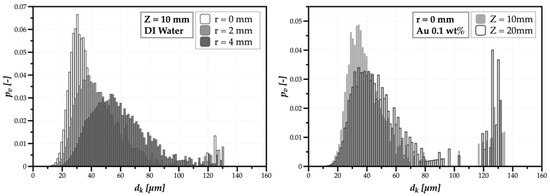 The example in Figure 7 (left) corresponds to DI water. The distribution represented is the volume-weighted probability size distribution. The fact that probability values decrease from the position at r = 0–4 mm means that more and different sizes acquired more relevancy in the spray. The size distributions on the right of Figure 7 correspond to the results with the largest heterogeneity degree for the nanofluid with 0.1 wt.% of gold nanospheres at r = 0 mm and both Z measurement planes.