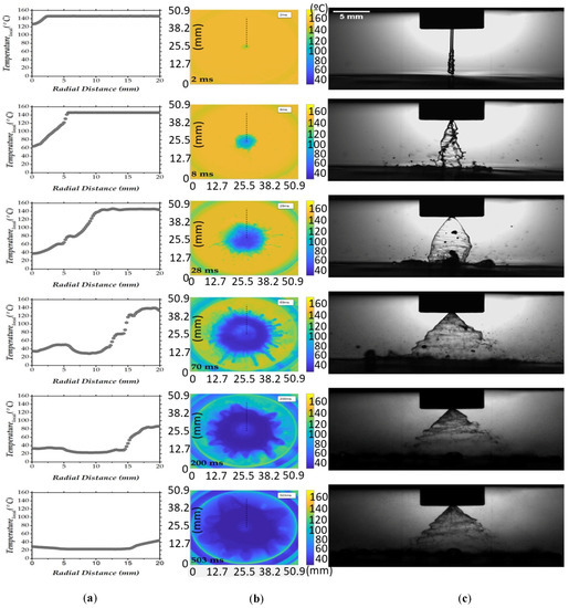 The heat transfer processes occurring during spray impact on the heated surface become more evident by looking at the spray morphology and its “thermal footprint” on the surface, as illustrated in Figure 8. This figure depicts the synchronized side and bottom views of the spray and the backside of the heated smooth surface (for a total area-averaged imposed heat flux of 2375 W/m2). The initial surface temperature (T0 = 145 °C.), taken with the high-speed video and high-speed thermal camera, respectively. The results presented correspond to the spray impact distance of Z = 10 mm. The experiments with an impact distance of 20 mm produced similar results, with an increase of the wetted area. The figure also depicts the temperature variation within the radial distance of the spray for the profile identified in the IR images by the dashed black line.