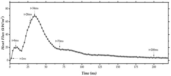 Figure 9 evidences the trend of the overall heat flux removed from the entire wetted area. The heat flux is maximum when the active cooling area or liquid film frontline is larger. At later time instants (t > 70 ms), as the temperature and heat flux values start to stabilize, the formation of secondary droplets at the edges of the spray intensifies. This phenomenon results from the splashing of droplets onto the liquid film. In theory, the spray cooling efficiency should decrease since the number of droplets leaving the surface without promoting heat transfer increases. However, the measurements performed here cannot evaluate this mechanism with the required accuracy to confirm this trend.